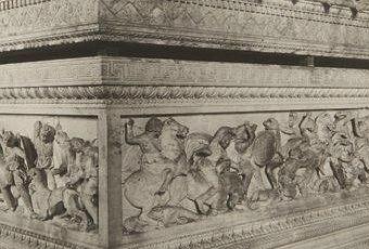 Sur cette oeuvre, c'est bien en conquérant qu'on représente le roi de Macédoine. Ce sarcophage grec le hisse fièrement sur Bucéphale, son inséparable compagnon qu'il aurait dompté avec l'aide d'Apollon. Il vainc ici l'armée du perse Darius, qui faisait énormément pâlir les Grecs, en 333 avant JC. C'est la première grande victoire du jeune roi qui allait très vite s'imposer avec l'impressionnant succès de sa phalange macédonienne. Darius y abandonna sa femme, ses enfants et ses trésors Par la suite, il prendra l'Egypte à Darius et deviendra pharaon d'Egypte à sa place. Enfin, c'est ce qu'on a longtemps cru car certains détails remettent en cause le fait que ça représenterait cette bataille. La peau de lion revêtue par Alexandre n'a été revêtue par le conquérant qu'après avoir remporté ses conquêtes contre les Perses. De plus, certains ont cru reconnaître Antigone Le Borgne or si tout ceci est vrai, il faut rappeler que ce dernier n'a pas participé à la bataille d'Issos. En clair, ce n'est pas une bataille qui est représentée mais la glorification d'Alexandre où on mélange plusieurs batailles.