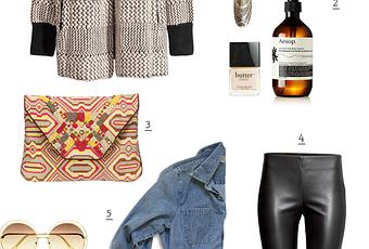 1.Gilet ample H&M // 2. Bague Amérindienne Le Monde est à Nous! Vernis à ongles beige Butter London Gel douche corps Geranium Leaf AESOP // 3. Grande pochette Antik Batik tissée et perlée // 4. Pantalon imitation cuir H&M // 5. Chemise en jeans Free People // 6. Lunettes oversize Chloé Carlina // 7. Sabots Swedish Hasbeens chez Spartoo.