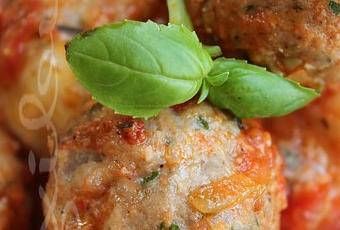 5)Dans un plat allant au four, mettez les boulettes avec la sauce, couvrez des tranches de mozzarella et faites cuire au centre du four 10 minutes ou jusqu'à ce que le fromage soit gratiné.