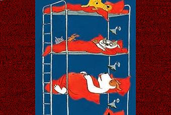 Cet album tout-carton, haut perché sur des lits superposés est trop drôle. Il met en scène 8 chiens qui dorment. Tous dorment sauf un! Il s'agit de Nono qui n'arrive pas à s'endormir à cause de Popov qui ronfle un peu trop fort. Il demande à Micha de lui lire une histoire mais chut!! Il ne faut pas réveiller les autres. Ainsi Nono va aller rejoindre le lit de Micha. Pedro se réveille et ne voit plus Nono dans son lit. Zaza s'agite aussi! Peux-tu me prêter ton doudou? Oui d'accord mais va le chercher! Tandis que Kaki ouvre un oeil, un autre compagnon a soif et Omar ne veut plus rester dans son lit... Bientôt tous les chiens sont réunis dans le lit de Micha et lisent une histoire! Ils sont réveillés...sauf Popov qui ronfle toujours aussi fort!