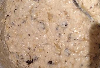 Ingrédient:- 25g de cacao en poudre(remplacé par 50g de pépite de chocolat)-450g de banana bien mûres (poids avec la peau)- 2 oeufs battus- 1/2 cc d'extrait de vanille- 225g de farine à levure incorporée - 110g de beurre- 110g de vergeoise blonde