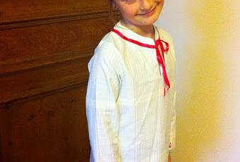 Cette tenue cousue par maman, est remarquable par son tissu. Il s'agit des carreaux des cahiers Seyes (les vrais carreaux d'écolier avec une marge). Ce tissu vient de chez Mondial Tissus à Villeneuve d'Ascq (ne le chercher plus j'ai pris la fin du rouleau… Mais je pense qu'on en trouve aussi chez Linnamorata). Ce tissu transforme ce vêtement en cahier d'école et louloute n'a qu'une envie : c'est que la maitresse y écrive "TB".