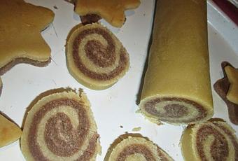 Mélanger la farine et le sucre, ajouter le beurre et les jaunes d’œufs. Commencer par mélanger a la fourchette puis a la main. Séparer la pâte en deux boules égales, dans une ajouter la vanille liquide et dans l'autre le chocolat en poudre.Mettre au frigo 30 minutes.Étaler les pâtes avec un rouleau, il faut qu'elle soit de la même épaisseur, superposer les deux pâtes et retailler les pour former un rectangle. Former un rouleau assez serré, j'ai utilisé du papier film pour le former.Le mettre 1 heure au frigo. Découper des rondelles de la même taille, mettre sur une plaque de cuisson et cuire pendant 10 minutes (ils ne doivent pas dorer, ils seront moins beau)