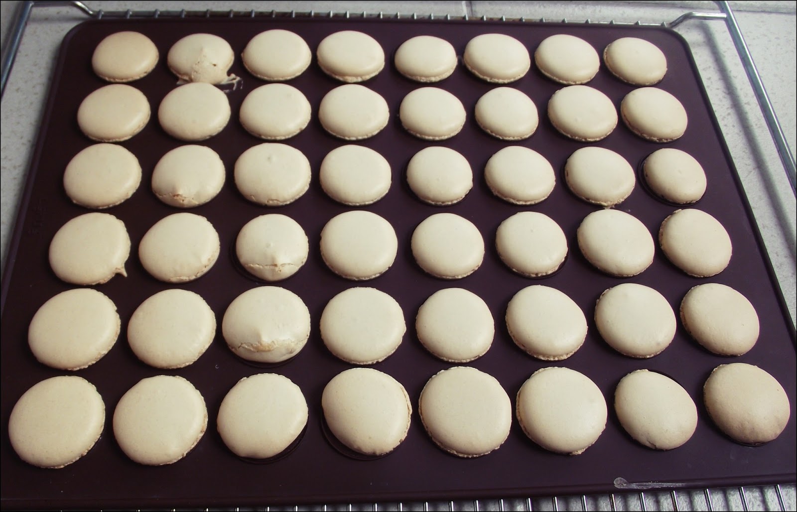 On passe ensuite aux coques de macarons. Il vous faudra donc ...200g de poudre d'amande200g de sucre glace5cl d'eau200g de sucre semoule2 fois 75g de blanc d’œufs (environ 5 blancs)extrait de café liquide pour colorer ou colorant alimentaire marronPréchauffer le four à 170°C en mode chaleur tournante.On commence par passer au hachoir la poudre d'amande avec le sucre glace afin d'obtenir un mélange homogène et sans grumeaux. Ensuite il est vraiment important de tamiser ce mélange : les morceaux sont les plus grands ennemis des beaux macarons !Après cela on met dans une casserole à fond épais l'eau et le sucre et avec un thermomètre de cuisine on attend patiemment que le sirop atteigne les 114°C. A cette chaleur là, on bat 75g de blancs d’œufs en neige jusqu'à ce que le sirop monte à 119°C.Arrivé à cette température, arrêtez le batteur et incorporez le sirop dans les blancs montés puis continuez de battre jusqu'à ce que le mélange refroidisse. La texture que vous devez obtenir est celle d'une meringue, épaisse et qui fait des pics vers le haut lorsque vous remontez le batteur. Ne pas oublier d'ajouter l'extrait de café ou le colorant pour colorer, directement dans la meringue.