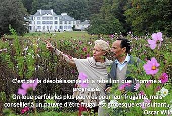 En photo, la princesse Constance de Polignac et son protégé/conseiller personnel Pierre Rabhi (du mouvement écolo de droite "Colibri") sur son domaine de Kerbastic, château du XVIIe siècle transformé en hôtel de luxe s'étendant sur un parc de 64 hectares dont 2 hectares "bio" accueillant des séminaires destinés aux chefs d’entreprise.