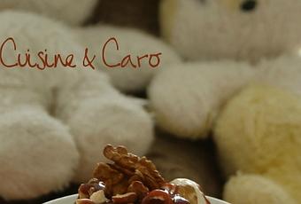 5. Verser le riz au lait dans des coupes individuelles, couvrir de noix et caramel tiède.