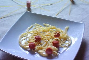">:) Cela n'a aucun intérêt gustatif, ni nutritionnel, c'est juste marrant, et moi j'aime bien car c'est très cratif avec seulement des saucisses de strasbourg et des spaghettis ont peut s'amuser: )d'ailleurs son auteur analyse très bien la chose avec profondeur et pertinence, je cite "je confirme ça un goût de saucisse avec des pâtes" évidemment ceci est du 2nd degrés et elle dit ça sur le ton de l'humour:) cette recette rigolote et originale je l'ai trouvé chez Loka du Monde de Loka un très chouette site avec une chaîne youtube. Et si vous voulez faire des knackis brunes utilisé des spaghettis à l'encre de sèches^^ Bref pour cela il vous faudra: