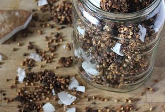 Casser en gros morceaux et ajouter les copeaux de noix de coco. Conserver dans un bocal et servir saupoudrer de farine de coco, avec un peu de lait végétal (le lait riz-coco est une tuerie).