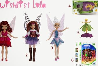 1. Poupée Rosalie2. Poupée Zarina3. Poupée Christal4. Parfum Clochette5. Fée Clochette volante6. Dvd Clochette