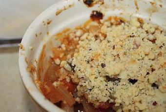 Dans un plat à gratin ou dans plusieurs petits ramequins, répartir le mélange tomates et oignons. Recouvrir de la pâte à crumble et enfourner pour 20 à 30 min à 180°C. Le crumble doit être légèrement coloré.