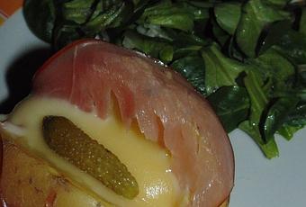 2) Fendre les pommes de terre en deux, les garnir d'une tranche de filet de saxe et d'un morceau de fromage à raclette.