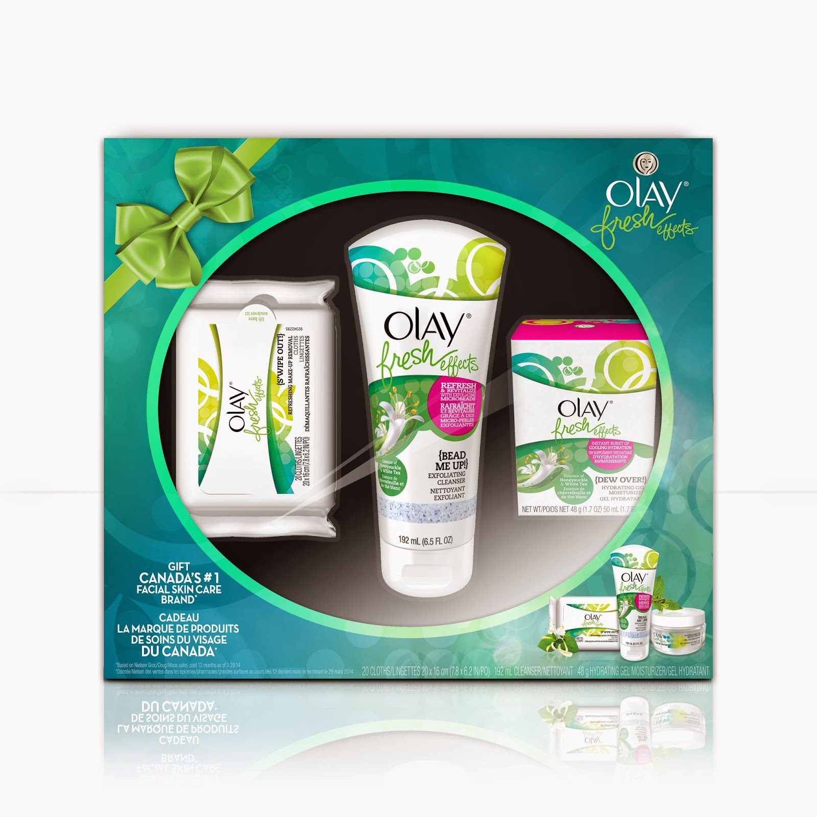 Coffret Fresh Effects d'OlayLe Nettoyant exfoliant Bead Me Up!, le Gel hydratant Dew Over! et les Lingettes démaquillantes rafraîchissantes S’Wipe Out! 24,99$