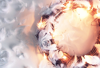 Matériel : ♥ une couronne en osier naturel♥ des plumes ♥ des boules décoratives argentées♥ une guirlande 20 LED blanche♥ un pistolet à colle♥ une paire de ciseaux ♥ du fil à coudre blanc