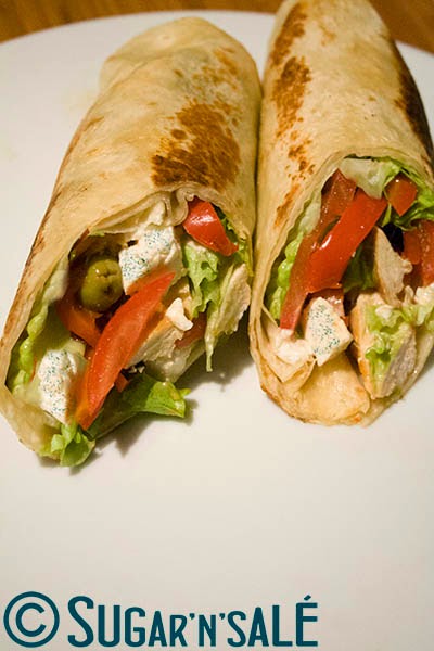 5. Humidifier et passer 20 secondes vos tortillas au micro-onde, les disposer dans une assiette et sur le bord proche de vous, disposer une belle feuille de salade, vos légumes tranchés, quelques morceaux de poulet, votre feta, vos olives et arroser d'un filet d'huile d'olive. Mettre un peu de thym et de poivre.