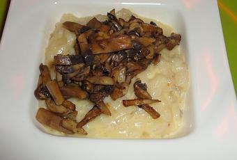 En fin de cuisson, ajouter le Camembert de Normandie coupé en fines tranches, et la crème bien mélanger pour l'incorporer, déposer les champignons réchauffés sur le dessus.