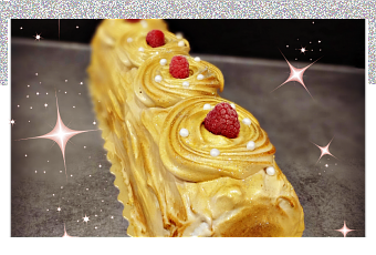 Une bûche composé d’un biscuit cuillère, d’un sirop aux litchis, d’un crémeux aux framboises et d’une meringue pour le décor.