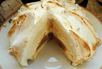 - Montez la bombe glacée : renversez la glace sur le biscuit puis étalez la meringue sur toute la surface du dessert. Passez 2 minutes sous le grill du four ou au chalumeau. ( le chalumeau dans le cas présent permet de mieux cuire et dorer la meringue ). Décorez et servez la bombe glacée aussitôt.