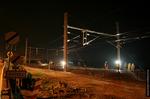 01h14 : Sur l'île aux boeufs, des éclairs jaillissent... On s'attèle à la découpe des rails. Les tronçons de voies sont séparés à la scie circulaire avant d'être enlevés par les engins. Il faudra ensuite les remplacer pour créer un nouveau tracé raccordant le nouveau pont.