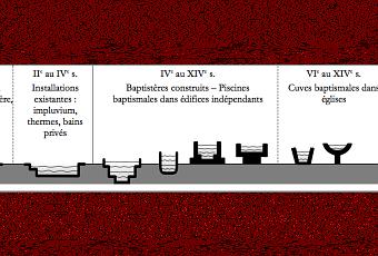 Évolution des installations baptismales au travers les siècles (tiré de Frédéric Bühler, Le baptême : aspects historique, archéologique, et biblique, Centre de Recherches d’Information et d’Entraide (CRIE), Mulhouse, p. 54-55) :