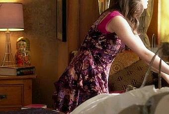 Cette chambre reste toutefois confortable et féminine dans un style vintage comme en témoigne les rideaux à volants et les tonnes de coussins jetés sur son lit. Son lit qui ne ressemble d'ailleurs pas à un vrai lit. Quand j'ai commencé cet article je me suis dit "non,ça c'est un lit-sofa,ou est son lit ?". Et bien, il était là juste devant moi, inondés de coussins tout doux, tout brillants, et pleins de couleurs qui clashent mais qui donne étrangement bien au milieu de tout ce bois et de toutes ces couleurs neutres.