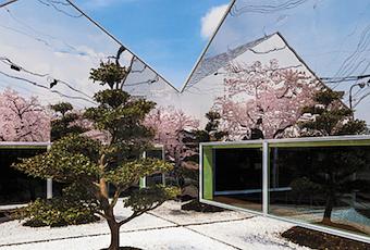 La société Bandesign a imaginé un café au Japon. Un café aux facades reflétant l’environnement fleurie des alentours, grâce à un système de miroirs polis qui se confrontent.