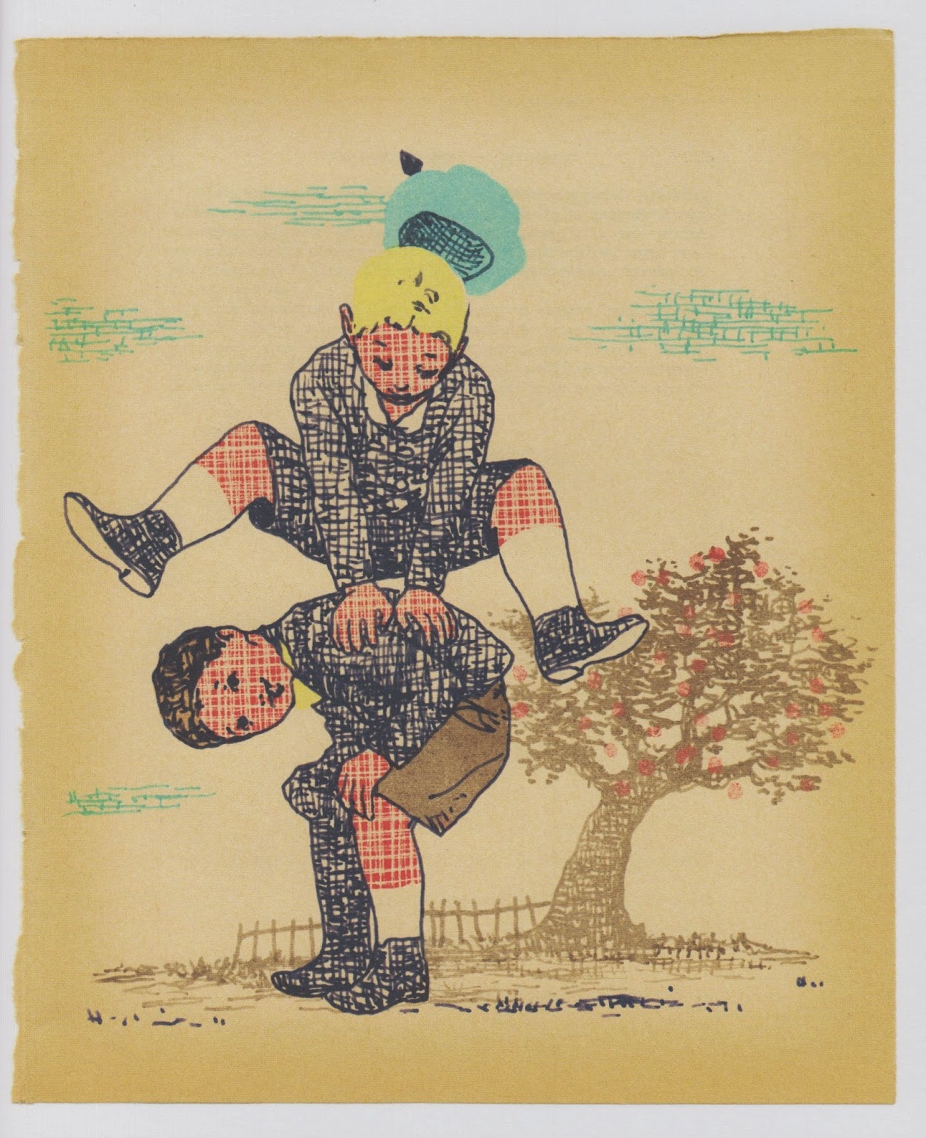 La classe reprend. Notre héros a des crampes à l'estomac, découvre son ventre bosselé à cause des petites pommes qui y poussent. Il se voit transformé en verger, sa peau devient de l'écorce d'arbre. Même quand sa mère lui coupe les cheveux après l'école, il a des visions atroces. Heureusement qu'il parvient à parler de ses angoisses à sa maman et qu'elle le rassure. Raphael est soulagé et voit à nouveau la vie du bon côté, même s'il envisage de renoncer aux pommes."Un pommier dans le ventre" apparaît extrêmement réjouissant grâce à son propos juste et jamais mièvre et à ses illustrations à l'ancienne qui racontent à elles seules le quotidien au siècle passé, quand on sautait à la corde et qu'on jouait à saute-mouton. Sereines et imaginatives, ces dernières accompagnent le texte et le complètent habilement.