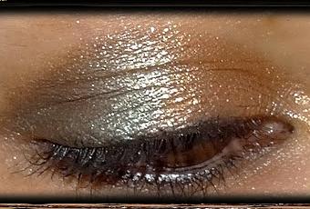 Sur toute la paupière, le mica "noisette scintillant" et en coin externe le mica "charbon irisé" (qui est un beau gris souris brillant).