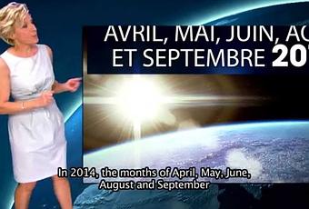 Dans le but de lutter contre le réchauffement climatique, l’Organisation Météorologique Mondiale (WMO pour World Meteorological Organization) a imaginé le bulletin météo du 18 août 2050 avec la complicité d’Evelyne Dhéliat. Ce jour-là, les températures atteindront les 40°C à Paris, 41°C à Strasbourg et jusqu’à 43°C à Nîmes…