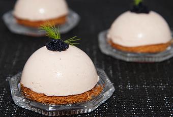 - Déposer délicatement les fonds de kadaïf sur un plat de service, placer au dessus les demi-sphères de mousse.