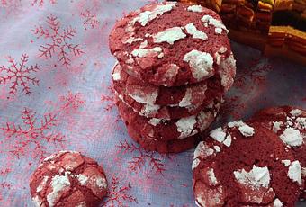 Cette année, je participe à un calendrier de l'avent culinaire (tout le calendrier depuis le début ici et page d'accueil ici) avec d'autres bloggeuses. Ma première recette arrive aujourd'hui avec notre thème "biscuits gourmands". Je me joins à Rabia (avec ses cookies cranberries) et Marie (avec sa spécialité d'Alsace : Bredele zimtsterne ici)pour vos donner quelques idées de biscuits. Pour ma part, j'ai choisi de cuisiner des biscuits craquelés et c'est en version rouge que je vous les présente pour Noël. La version traditionnelle est de Marta Stewart à base de chocolat et cacao (il faudra d'ailleurs que je les fasse!) et pour les miens j'ai gardé la base cacao, ajouté des pépites de chocolat blanc, le tout en rouge avec du colorant pour le côté Noël! Ils sont délicieux, craquants et fondants, parfaits pour le café ou à offrir en cadeaux gourmands !