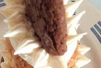 Remplissez une poche à douille de crème déco et faites un cercles sur le gros choux et déposez un cookies puis un petit choux et faites le tenir en formant des piques de crème autour puis décorez le dessus du petit choux comme sur la photo