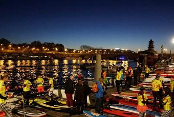 Vendredi après-midi je suis allée au Salon confirmer mon inscription et récupérer lycra et puce (une nouveauté cette année), hier samedi j’ai participé à un cours de SUP yoga avec Sarah Hébert vice championne du monde de Windsurf, et je suis restée au Salon à en prendre plein les yeux jusqu’à l’heure du briefing sur la course. On nous a exposé toutes les règles de sécurité sur la Seine, les règles lors du départ… et ça rigole pas hein du coup petite montée du stress mais surtout de l’envie de participer à cet événement mondial en compagnie entre autre de Kai Lenny champion du monde de la discipline, Antoine Albeau 22 fois champion du monde de Windsurf, Sarah Hébert, et bien d’autres… Ce matin réveil donc à 5h pour un départ du pont de Tolbiac à 8h, départ de nuit donc… Un petit 2 degrés extérieur et une Seine chauffée à 9 degrés… Là ça motive pour éviter la chute potentielle car bon malgré ma combi intégrale et mon superbe lycra jaune fluo, j’aurais été refroidie en 2 secondes. Une fois sur place je récupère ma board dans le semi remorque pour la gonfler et la préparer, je mets mon leash et suis fin prête. Je retrouve ma petite bande de l’association dont je fais partie tous revêtu du même legging à damier et chose étonnante on passe le temps à papoter. On se rassure comme on peut sur la mise à l’eau car cette année la marche est haute (quasi 1m) et hors de question de partir trempée… J’appréhende beaucoup. Puis vient le moment tant attendu, le départ. Je regarde Kai se mettre à l’eau puis met ma planche dans l’eau et réussit à me mettre dessus et m’éloigner du bord à genou. Aussitôt je me mets sur mes jambes qui tremblent le temps de s’habituer au clapot déjà présent.