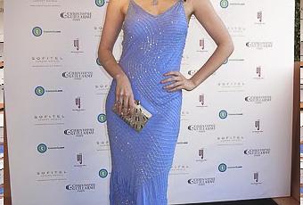 La comédienne Sarah Barzyk a choisi un fourreau rebrodé en mousseline bleue Christophe Guillarmé, pendentif et bague VIJ Paris et une minaudière et escarpins Carmen Steffens, coiffure L'Oréal Professionnel Maroc, maquillage Morgane Rivet Art Make Up.