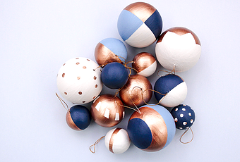 L’année dernière nous avions des envies de rouge, d’argenté, de blanc et de bois, une gamme assez traditionnelle dans l’esprit scandinave. Cette année, les couleurs que nous avons choisi sont assez tendres. Un camaïeu de bleu et de crème relevé par une pointe de cuivre pour apporter de la lumière. Nous vous montrons ce Do It Yourself tout simple, nous y avons passé le dimanche après-midi, devant un film et quelques tasses de thé.