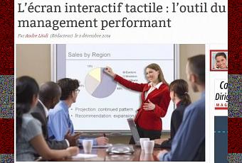 Encore un publirédactionnel un peu limite. Voilà que les écrans interactifs permettent de manager comme par magie !! L'article explique que l'outil permet des animations révolutionnaires mais tous les photos présentent des copies de....powerpoint. (même pas prezi ou une belle carte d'idées). On remarque aussi sur la photo principale que les participants continuent à prendre des notes avec leur stylo, ce qui va dans le sens de notre diagnostic sur la qualité des réunions (plus d'un participant sur 2 prépare son propre compte rendu et prend même le temps de vérifier lorsque le cr officiel arrive enfin...)