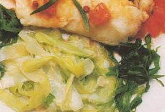 Dressez chaque filet de poisson sur assiette, réchauffez au four si nécessaire, disposez à côté de la fondue de poireaux, et décorez de vert de poireaux et de dés de tomate + quelques peluches d’estragon. nappez de sauce et cernez d’un cordon.