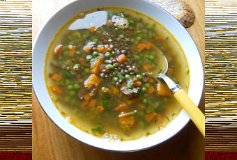Soupe de lentilles, courge butternut, petits pois et coriandre
