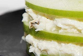- Monter le mille-feuille en alternant pomme et préparation de crabe.