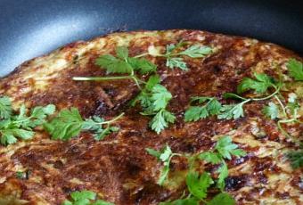 une belle crique terre / mer, parfaitement équilibrée, composée de pommes de terre finement râpées, parfumée d’oignons et généreusement garnie de queues d’écrevisses,
