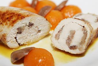 - Servir les ballotines avec les billes de potiron confites, les marrons et la sauce.