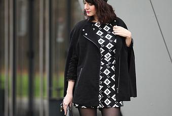 Une tenue aujourd’hui tout en noir et blanc : cape, casquette navy, et mix and match d’imprimés bicolores graphiques ! Bonne semaine à toutes et à tous !