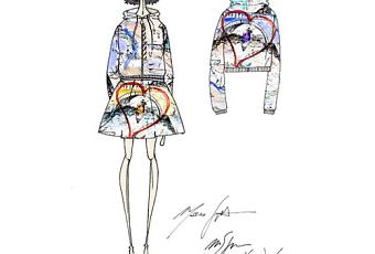La collection est composée d'une jupe genoux, d'une robe évasée, d'un sweat, d'un tee-shirt, d'un coupe-vent très mode, une paire de slippers, une paire de slip on.....