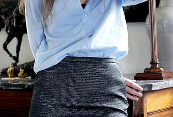 L’an dernier, brocart et marinière s’entrechoquaient brillamment (souvenez-vous), mais cette année, c’est une chemise en chambray tout ce qu’il y a de plus classique et casual qui viendra cooliser ma petite jupe jacquard étincelante. Du coup, de 8 à 20h, j’assurerai tranquille en sparkling working girl, et le soir venu, après un bref détour par la case rafraichissement, je débarquerai festive, pile poil pour le début des hostilités !