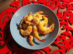 -Faites dorez un oignon dans du beurre-ajoutez ail, miel, jus de lime, piment-laissez caraméliser-ajoutez les crevettes et le sésame (3min)-ajoutez de la ciboulette-servir avec du rizTemps de préparation : 10min