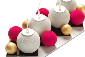 Telles des bougies et leurs flammes incandescentes qui ornent les tables de fêtes, cette bûche révèle l’éclat des saveurs en trois temps de dégustation, symbolisés pour chaque part par 3 sphères, disposées sur une fine plaque de chocolat noir.