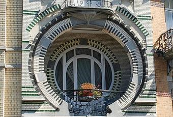 Le deuxième étage est percé d'un triplet de trois baies. La baie centrale est une porte-fenêtre cintrée précédée d'un balcon en fer forgé d'un style Art nouveau géométrique très pur. Cette baie est surmontée d'un arc dont les claveaux sont constitués de briques vernissées vertes et blanches. De part et d'autre prennent place de fines baies surmontées d'un arc rampant, et ornées de bas-reliefs ornés de grappes de fleurs.