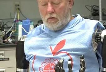 Leslie Baugh a été amputé au niveau des épaules après un accident il y a 40 ans. Il réapprend l'autonomie grâce ses prothèses robotisées. Leslie Baugh a été amputé des deux bras il y a 40 ans suite à une électrocution. Pourtant, depuis cet été, il a réussi à se servir de deux bras bioniques avec suffisamment de précision pour déplacer une tasse sur une étagère.