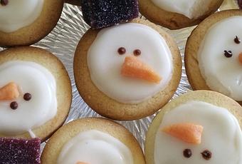 on forme des palets, on fait cuire 15 mn au four T°5. Attention, les biscuits ne gonflent pas à la cuisson mais prennent une belle couleur blond pâle. Puis, on décore. Pour la décoration, j'ai réalisé un glaçage blanc (en mélangeant du 300 grammes de sucre glace avec un blanc d'oeuf), puis j'ai fait 2 yeux avec du chocolat fondu et ai réalisé le nez avec de la pâte d'amande que j'ai colorée en orange.