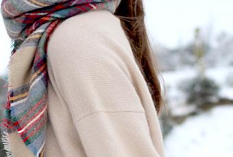Au programme, un maxi pull en mohair couleur crème Acné Studio, une écharpe enveloppante couleur tartan shoppée chez Zara l’an passé (de nombreux nouveaux modèles cet hiver tout aussi beaux!), un jean slim basique Mango et des bobottes mi peau mi pluie Nouchka.