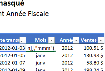Il serait possible de travailler « manuellement » les dates fiscales dans un tableau croisé dynamique, mais le tout comporte quelques limites. Pour ce faire, il faudrait simplement ajouter une colonne « Mois » à la base de données d’origine et y insérer le nom des mois correspondants. Par exemple, ci-bas, j’ai utilisé la fonction TEXT (ou TEXTE en français) avec l’abbréviation « mmm » pour obtenir le nom des mois où a eu lieu chacune des transactions de vente de ma base de données. Idéalement, on n’ajouterait pas de colonnes calculées dans la base de données Excel pour ne pas l’alourdir inutilement. On passerait plutôt, par exemple, par Power Query ou Power Pivot ou encore, on utiliserait une macro VBA pour copier la formule aux nouvelles données et les coller ensuite en valeurs.